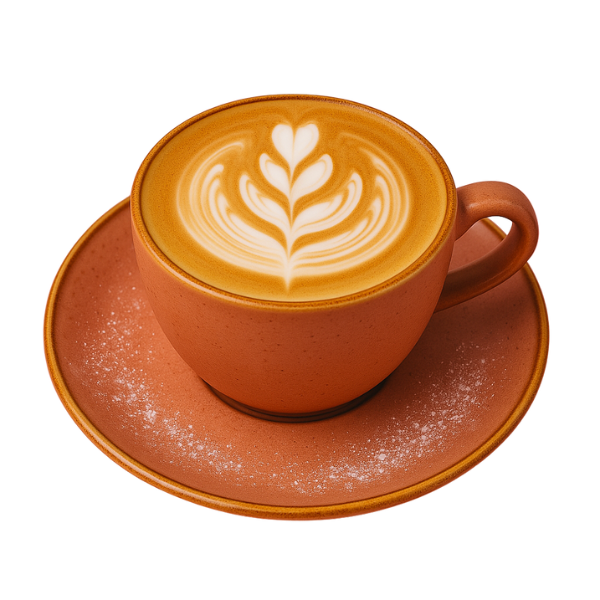 Café con leche espumosa y chocolate, servido en taza de cerámica con arte latte en forma de corazón. Un equilibrio perfecto entre intensidad y suavidad, ideal para calentar el alma y acompañar algo dulce.
