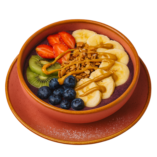 Un tazón lleno de energía y frescura: cremoso açaí amazónico, naturalmente dulce y antioxidante, servido bien frío y acompañado de frutas frescas de temporada, crujiente granola y un toque de miel.
