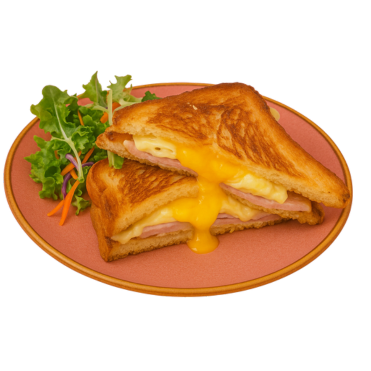 Sándwich dorado a la plancha con jamón, queso fundido y huevo a medio cocer que se derrama con cada bocado. Crujiente por fuera, cremoso por dentro: un clásico reinventado para los amantes del brunch contundente.